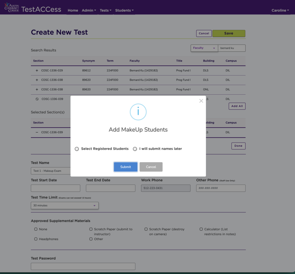 - A message will appear asking you to Add MakeUp Students with the options “Select Registered Students” and “I will submit names later.”